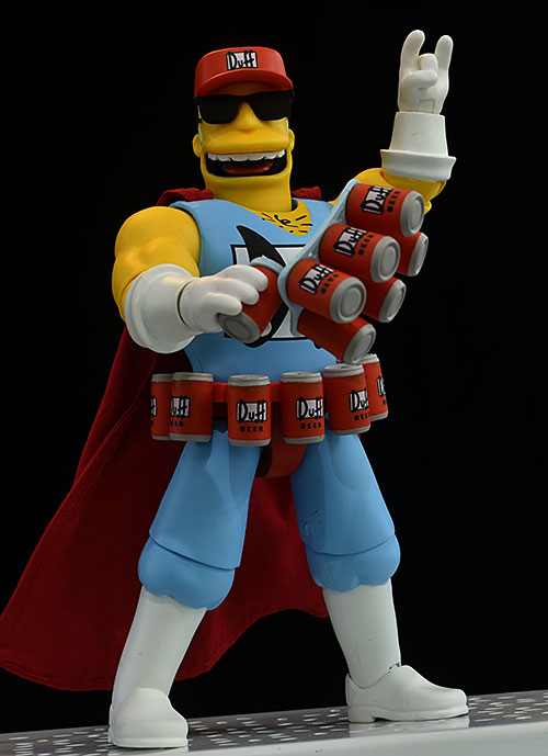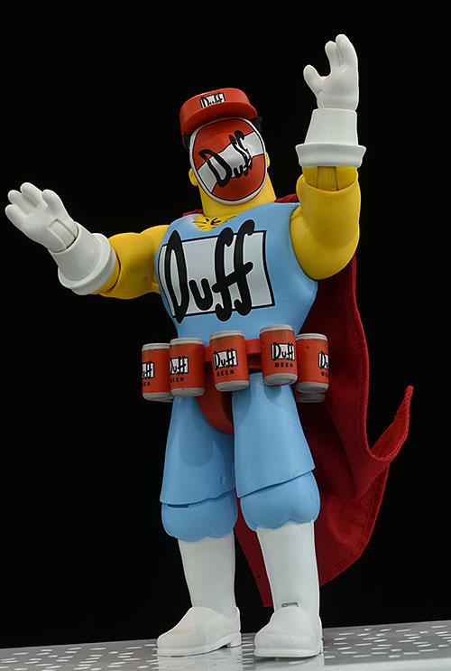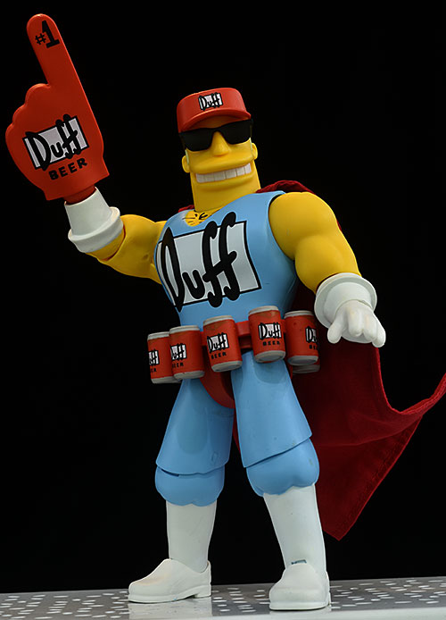 Up next, Duffman. He also has the two aforementioned extra heads, as well as the 'sticker' that can be removed from his face. He has nine extra hands, in various Duffman poses, plus one wearing the Duff beer 'number one' foam finger. He has a seven pack as well, from this famous scene.