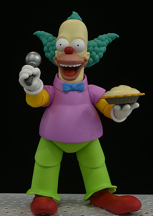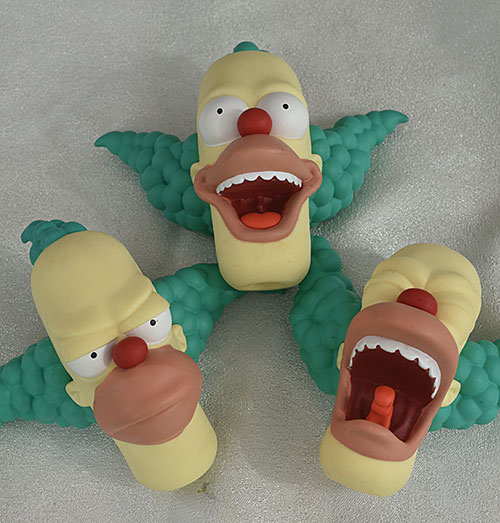 Let's start with Krusty. The standard head has the wide smile, open mouth expression that was his usual look for the kids. You can almost hear him saying "hey, hey!" He also comes with a screaming portrait, and a depressed, cranky version. It's this last one that I really love, that really sets him apart on the shelf.