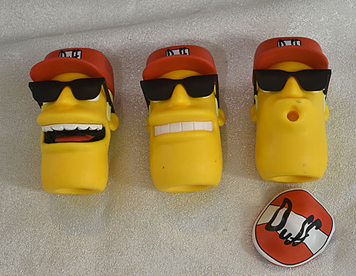 Last but not least, there's Duffman. He tends to be a happy dude, so there's one with a simple smile, and one with an open mouth smile. They all have permanently attached glasses and hats. The third head is pretty specific, from the episode with Handsome Moe, who drives up and says "See how you like a sticker on your face!" and then slaps a Duff sticker over his mouth and nose. This one has the sticker, sculpted in plastic, which attaches with a post that goes into a O shaped mouth. You can remove the sticker, as show in the photo below, although I'm not sure that's a great idea.