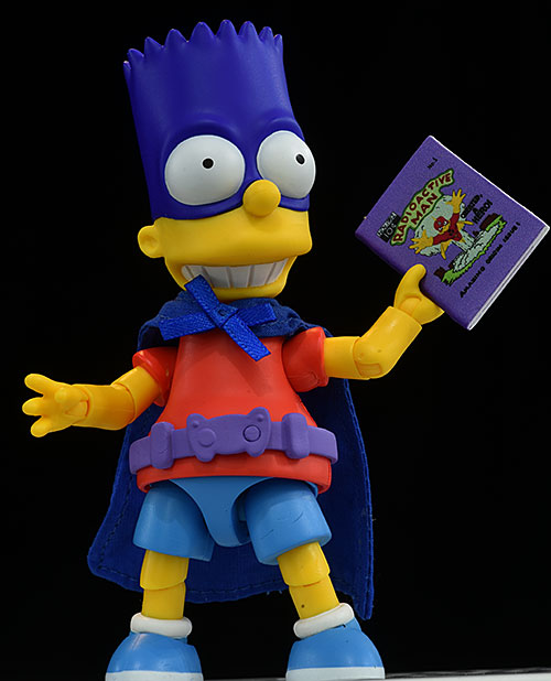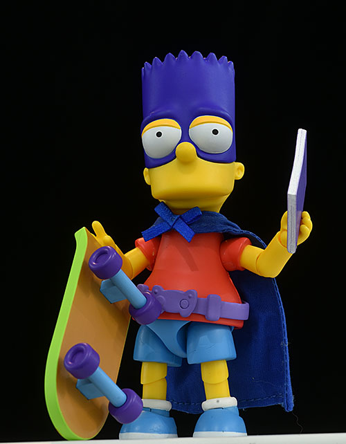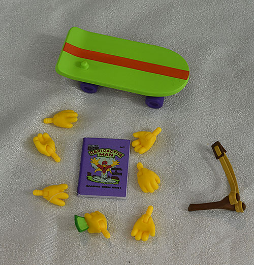 Next up, Bartman. Along with the two additional heads, he has seven additional swappable hands, including one sculpted gripping some bills. There's the necessary skateboard, as well as a slingshot sculpted so he can be posed shooting it with both hands. And there's a Radioactive Man comic as well.
