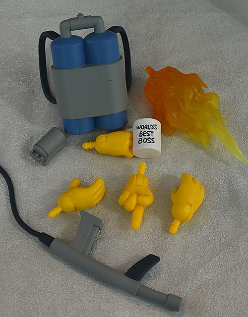 But his large accessory is the flame thrower. There's the fuel tanks for his back, the hose that attaches from the tanks to the wand, the wand, and a large flame effect that can be attached to the end of the wand.