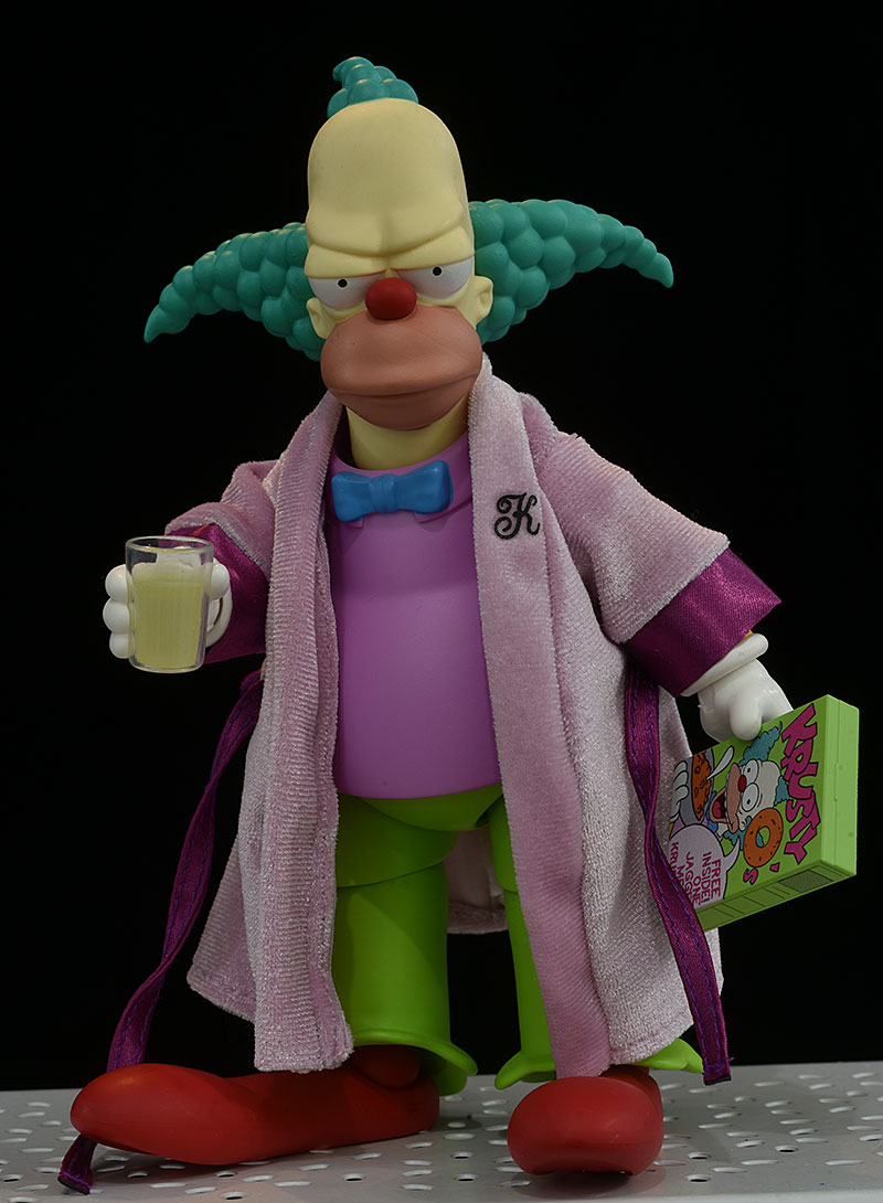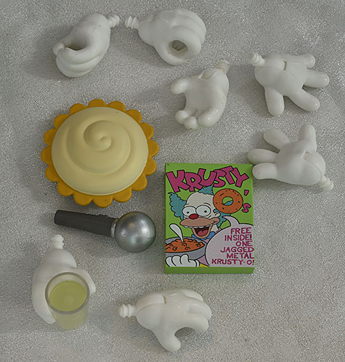Again, let's start with Krusty. He has seven extra hands, designed to work with various other accessories or specific poses. One is sculpted with a glass containing some liquid (they let you imagine what that is) in his grip. He has his much needed microphone, as well as a pie and a box of Krusty-O's. The detail work on the label for the cereal is very nicely done, and looks great. The best extra is one I hadn't expected I'd like - his cloth bathrobe. It fits great, and works perfectly with the one sullen head and glass holding hand. I wished we'd gotten a right hand with a cigarette, since that would have really completed the look, but I get why they decided against it.