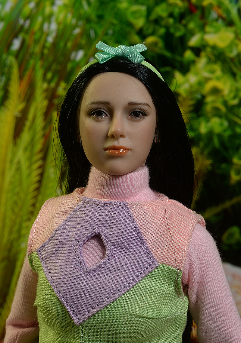 The skin tone isn't super realistic because it's so consistent and even, but too much mottling, freckling, or spotting would look wrong on such a young character. The eyes are sharp and clean, and have enough gloss to create their own natural catch lights. The eyelashes look good in hand, and the eyebrows and lips are clean. The lips are a little too glossy, and the lip line inside is a little too obvious, but these are minor nits.
