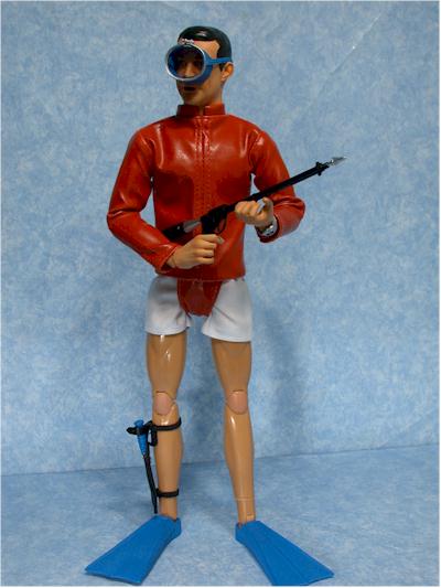 includes his wet suit upper, white shorts, and flippers.