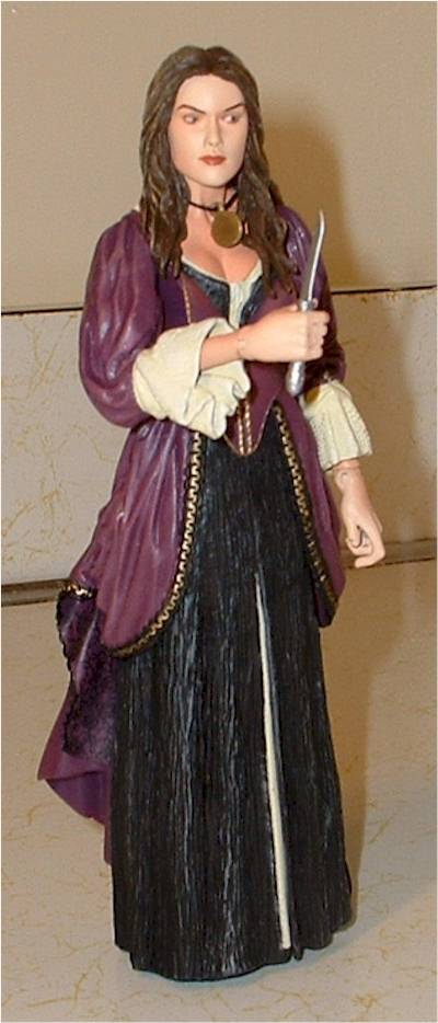 Folks, ya wanted Keira Knightley immortalized forever in plastic? I think you’ll be happy to note you’ve officially gotten what you wanted! I have no idea how easy or hard her likeness was to capture- I know that for some, especially the ladies, likenesses tend to be VERY difficult to capture- but NECA got hers DOWN PAT. The area I think that was “must get” on her was the influx look of her cheekbones- and they did it perfectly. She has a serious, yet “accepting” look on her face, and that fits in well with the character. The dress looks absolutely perfect as well. Now, to add an extra nice touch, to KEEP her standing up( since her legs were not sculpted the same length- either that, or the area they were attached to was not perfectly level), rather than make the bottom of the dress a flapped bending plastic( sort of like Galadriel, from ToyBiz’s Lord of the Rings line), they went with the dress being a hard plastic, and sculpted a small “barrier” around her legs. Nicely done- it’s not perfect, but with some minor work, you can get her standing fine.