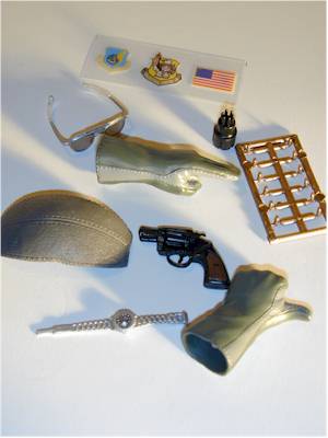 handgun, sunglasses, a watch, a unique stand, and a full size badge. Also