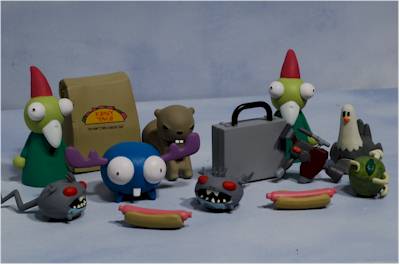 There are two hot dogs, two lawn gnomes, a squirrel, a pigeon, sack of