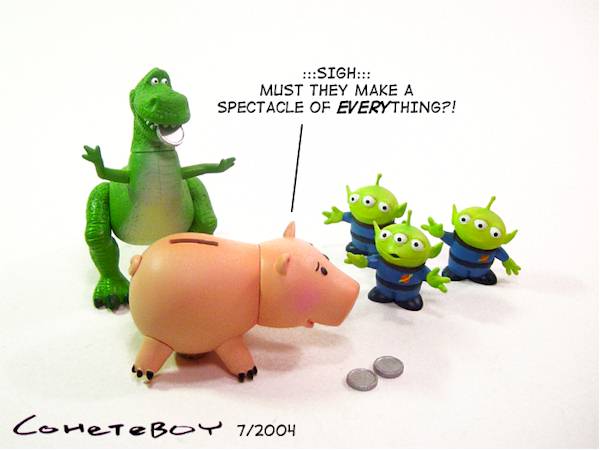 since these characters were strong enough without them. Both Rex and the Aliens came with nothing but there's always the little piggy that could. Hamm is a real working piggy bank! He comes with three plastic coins that fit into his back as well as a removable cork! Now that's pretty darn clever and very cool for an action figure of a piggy bank.